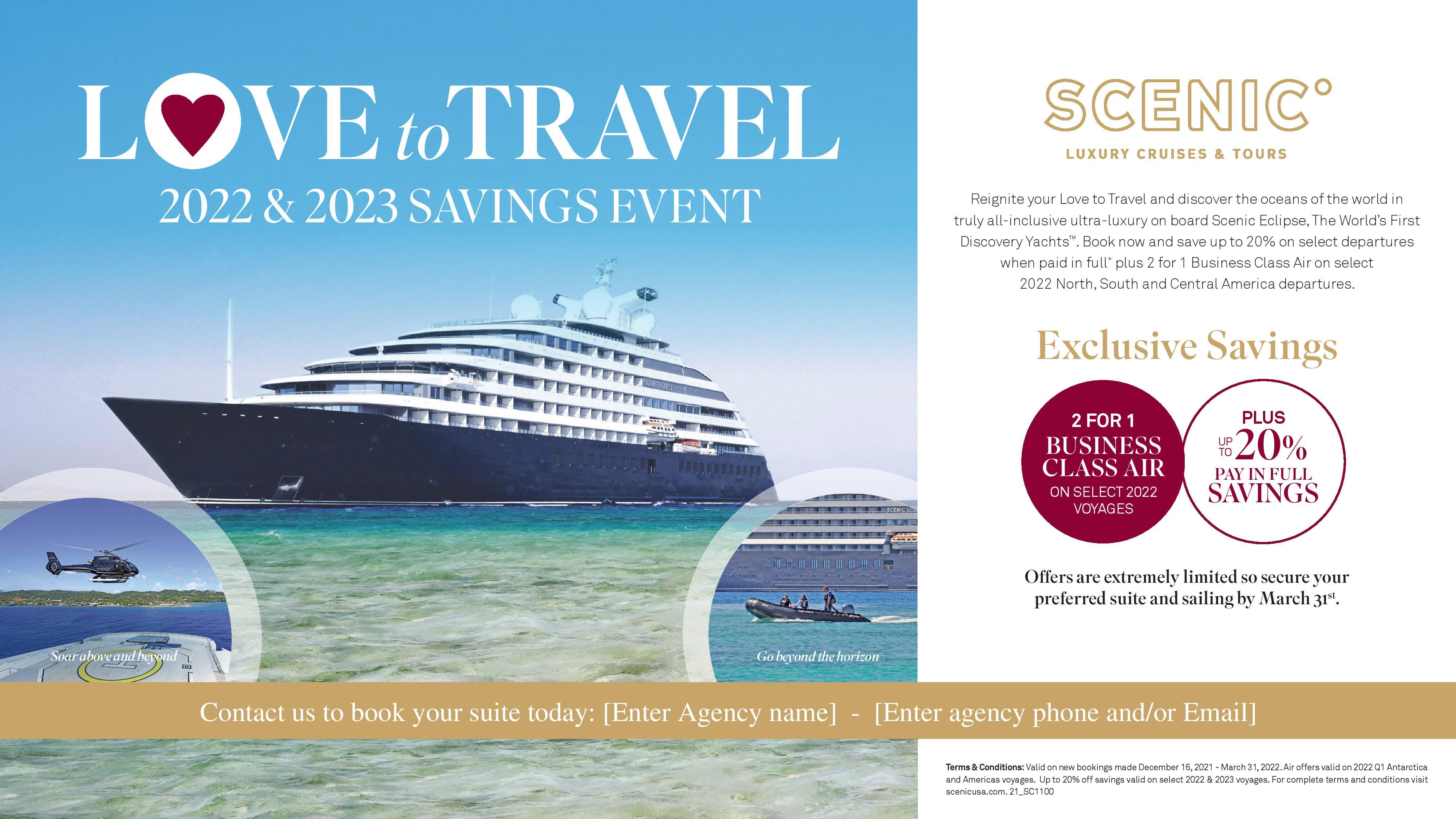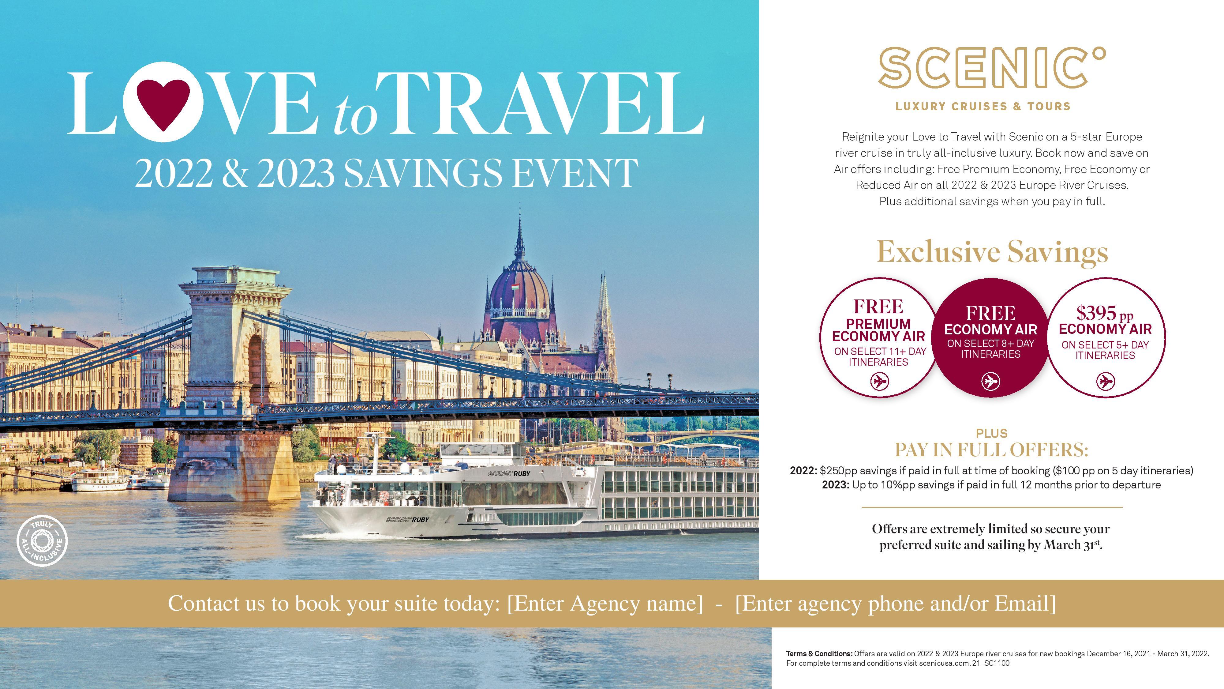 Reignite your Love to Travel in truly all-inclusive luxury with Scenic in 2022 and 2023. Below are the details of our current Wave offers running through March 31st.