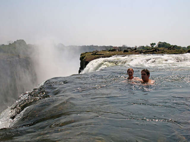 And as for the top picture? Victoria Falls has a famous natural feature on the Zambian side, an 'armchair' called the 'Devil's Pool' near the edge. When the water is at a certain level, a rock barrier reduces the current in that spot to relative calm. Daredevil adventure-seekers risk death to swim only a few feet away from that 350-foot drop.